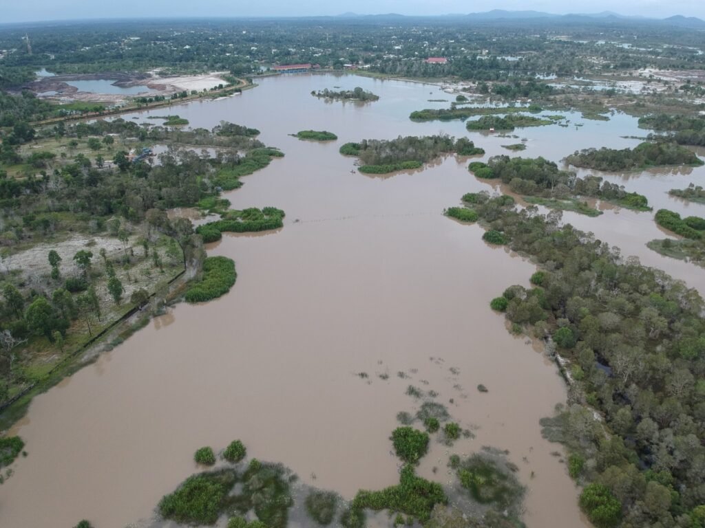 Hamparan kawasan Sungai Lenggang di Belitung Timur tampak digenangi air hingga meluas, memperlihatkan bagaimana hilangnya tutupan hutan dan aktivitas tambang yang merusak bentang alam telah melemahkan kemampuan daerah ini menahan limpasan air.