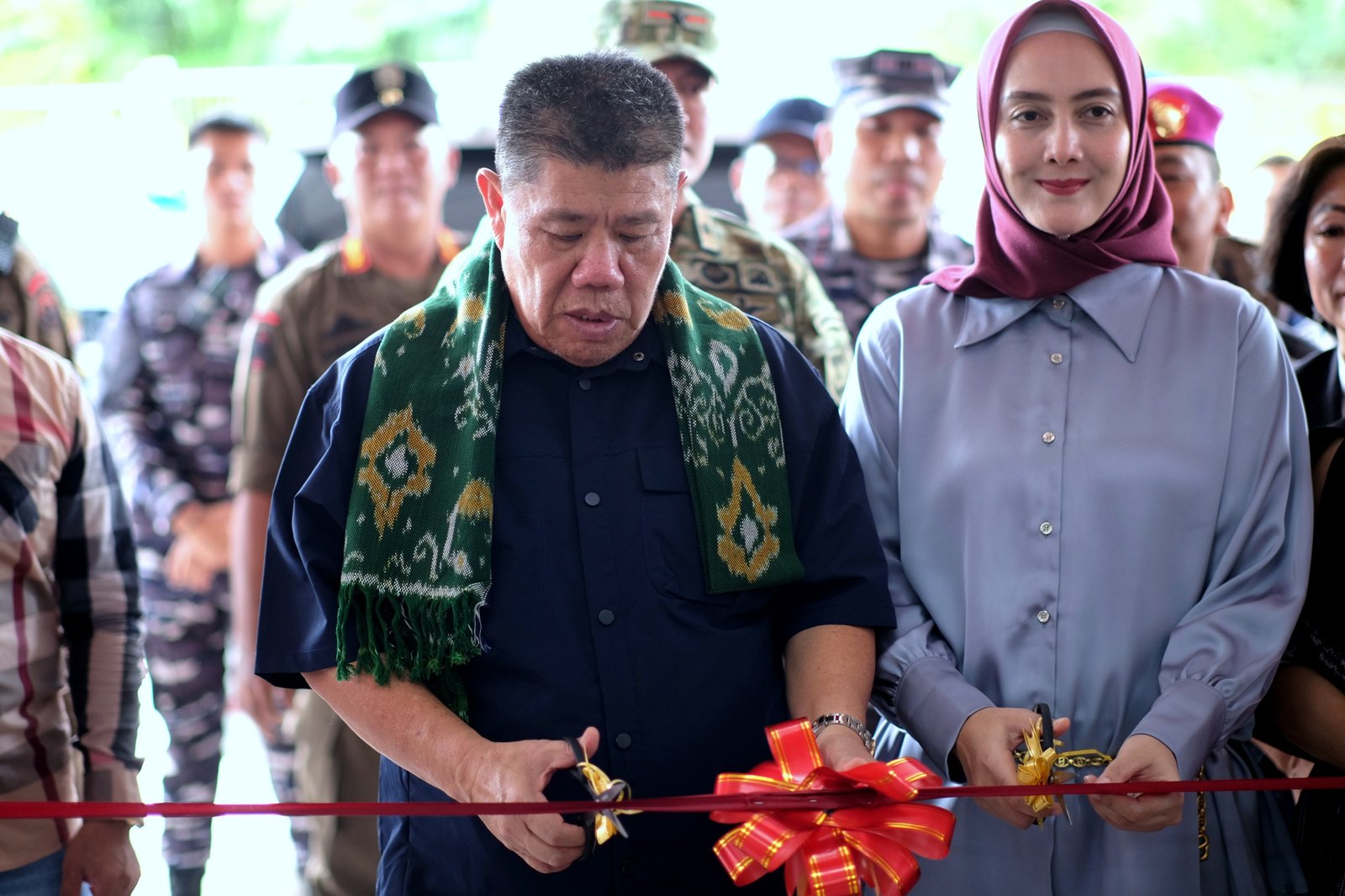 Gubernur Kepulauan Bangka Belitung Hidayat Arsani, didampingi Ketua TP PKK Babel Noni Hidayat Arsani, melakukan pemotongan pita sebagai tanda peresmian tiga unit usaha di kawasan Air Mangkok, Pangkalpinang, Minggu (11/1/2026).