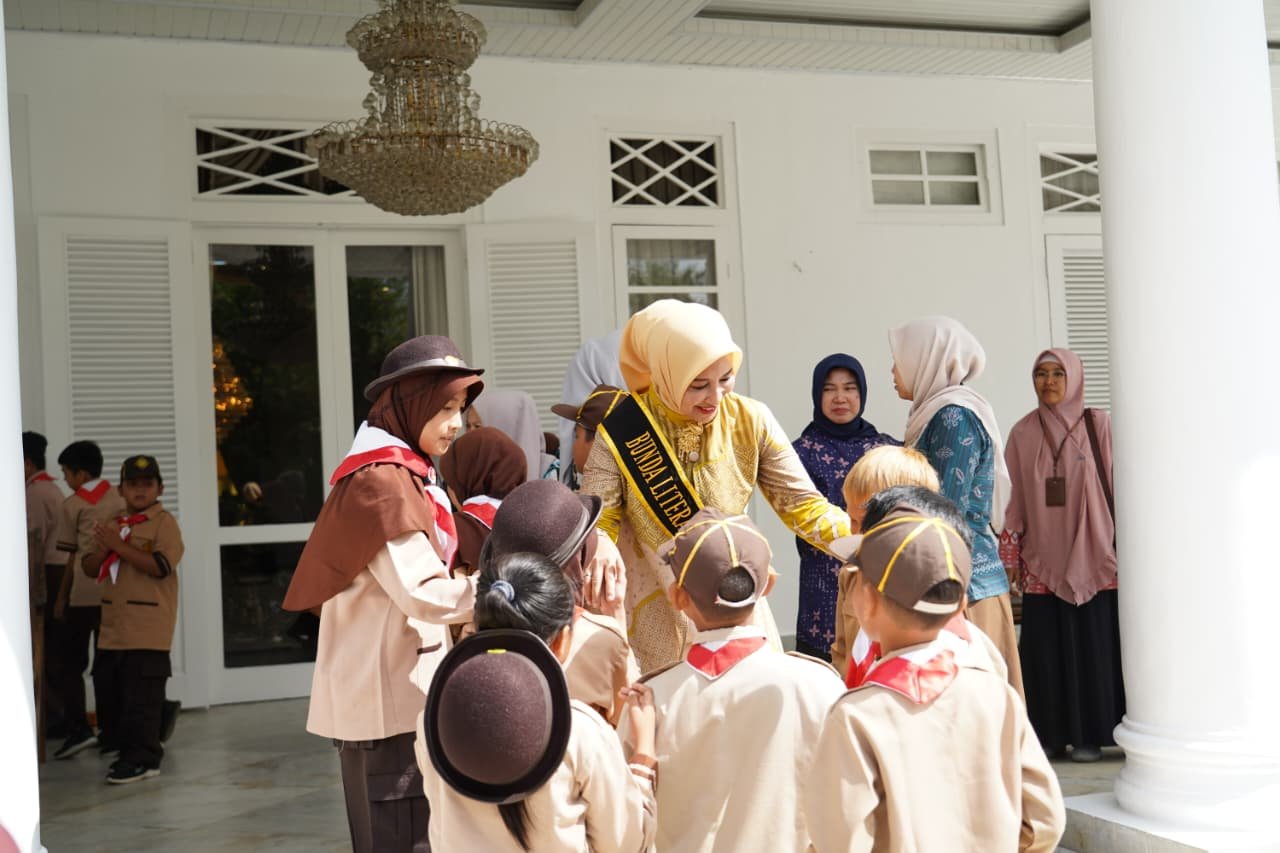 Ketua TP PKK Kota Pangkalpinang sekaligus Bunda Literasi, Susanti Saparudin, S.E., menyambut dan berinteraksi dengan siswa SD saat kegiatan house tour sejarah di Rumah Dinas Wali Kota Pangkalpinang.
