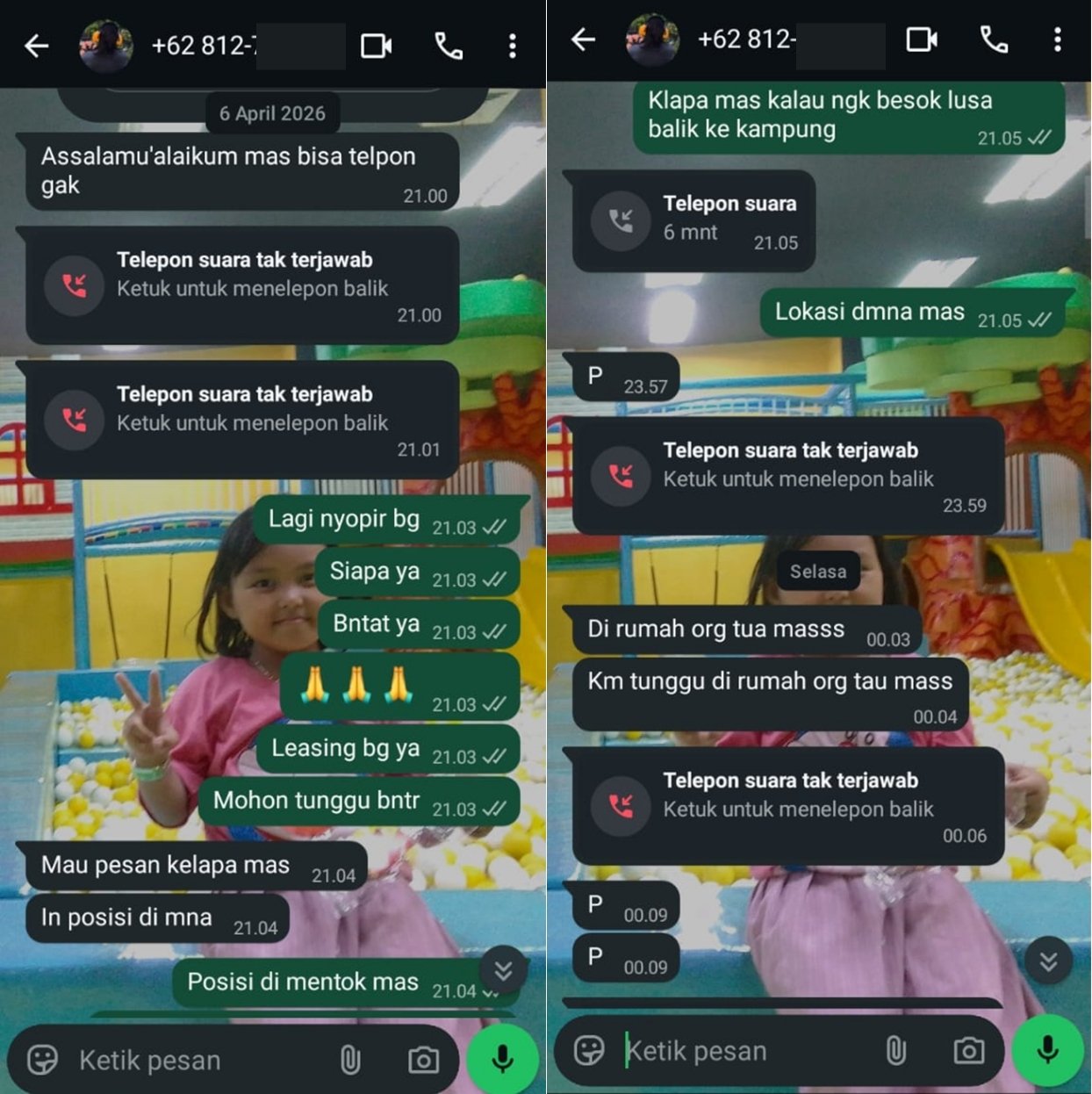 Tangkapan layar percakapan WhatsApp yang diduga menunjukkan upaya pendekatan dengan modus pemesanan kelapa sebelum terjadinya penarikan kendaraan milik Afrizal.