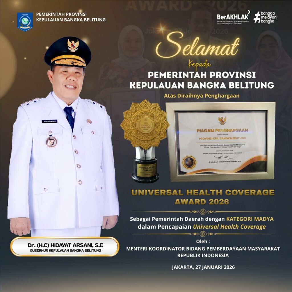Penghargaan tersebut diterima Gubernur Babel Hidayat Arsani yang diwakili oleh Penjabat Sekretaris Daerah (Pj Sekda) Babel, Fery Afriyanto, dalam rangkaian Deklarasi dan Pencanangan UHC yang diselenggarakan oleh Kementerian Koordinator Pemberdayaan Masyarakat (Kemenko PM) di Ballroom JIExpo Kemayoran, Jakarta, Selasa (27/01/2026).