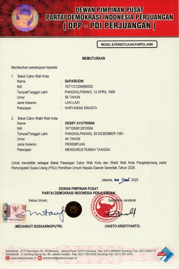 Surat Rekomendasi dari DPP PDIP untuk Bacalon Wali Kota dan Wakil Wali Kota Pangkalpinang dalam rangka Pilkada Ulang 2025 (Foto: dok.