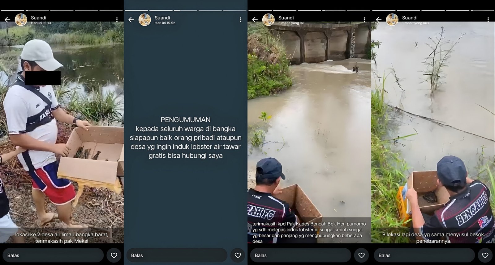Rangkaian tangkapan layar status WhatsApp milik Suandi yang menunjukkan pelepasan induk lobster air tawar di sungai umum serta pengumuman distribusi induk lobster kepada warga dan desa.